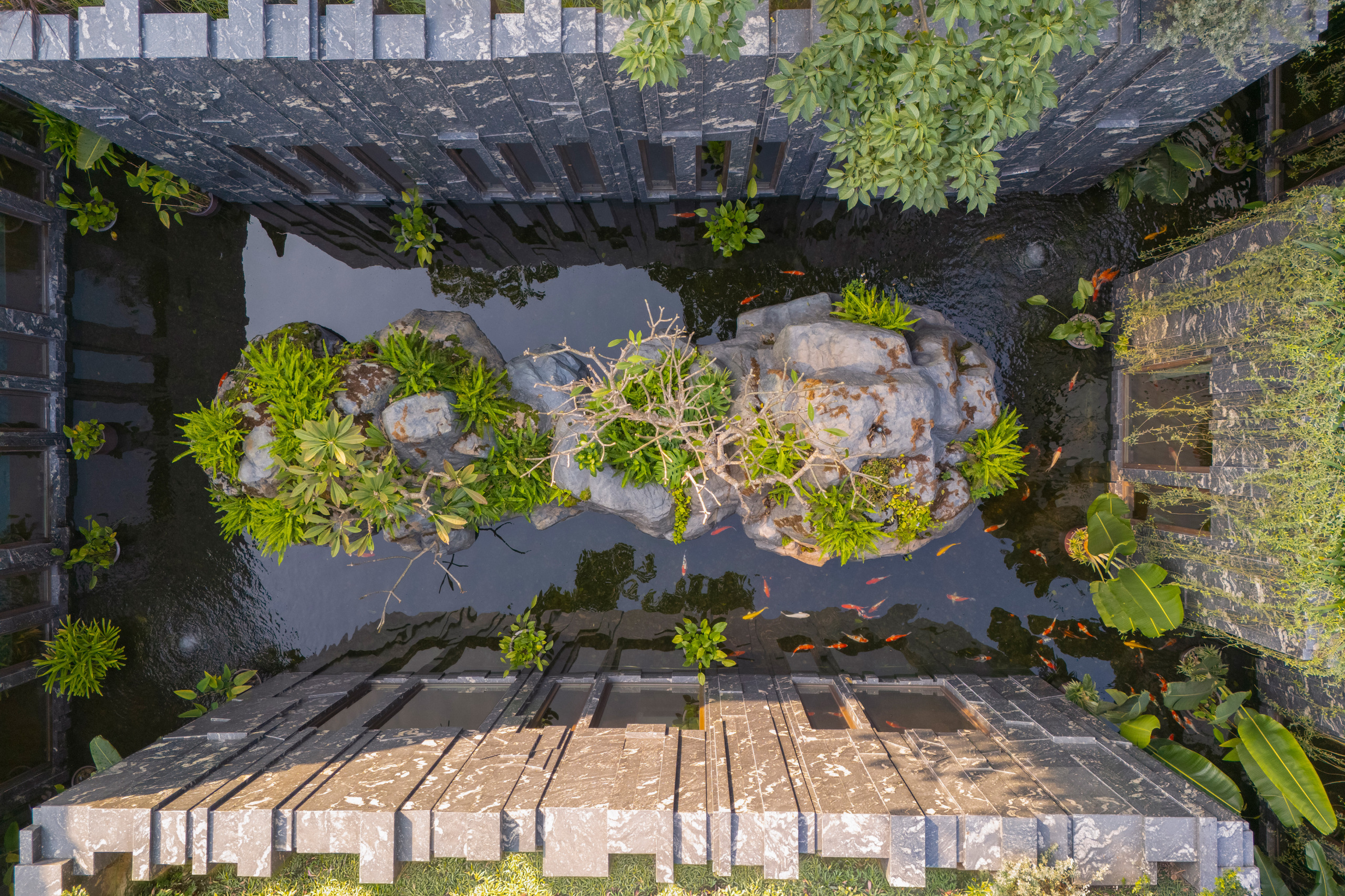 The hotel and residences convey the vibrancy of the area and the natural appeal of Halong Bay. Large stonework that surrounds the hotel and residence tower motor courts is inspired by the local legend of Halong Bay. The sunken garden in the spa mimics one of the many hidden lagoons in the bay. The architecture weaves a narrative from ancient tales and the raw, striking backdrop of land, ocean, islands, and islets of Halong Bay.