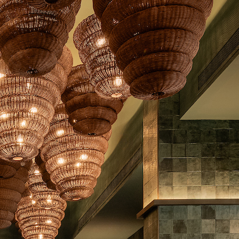 Onu at Giza Palace is a sophisticated celebration of Pan-Asian textures and flavors. With a bold ceiling feature inspired by traditional Vietnamese fishing baskets, drawing guests’ eyes upward, creating a rhythmic canopy that settles over guests. The woven aesthetic carries through in the seating and floor lighting, which subtly traces the contours of the tables, creating a cohesive and immersive atmosphere.
