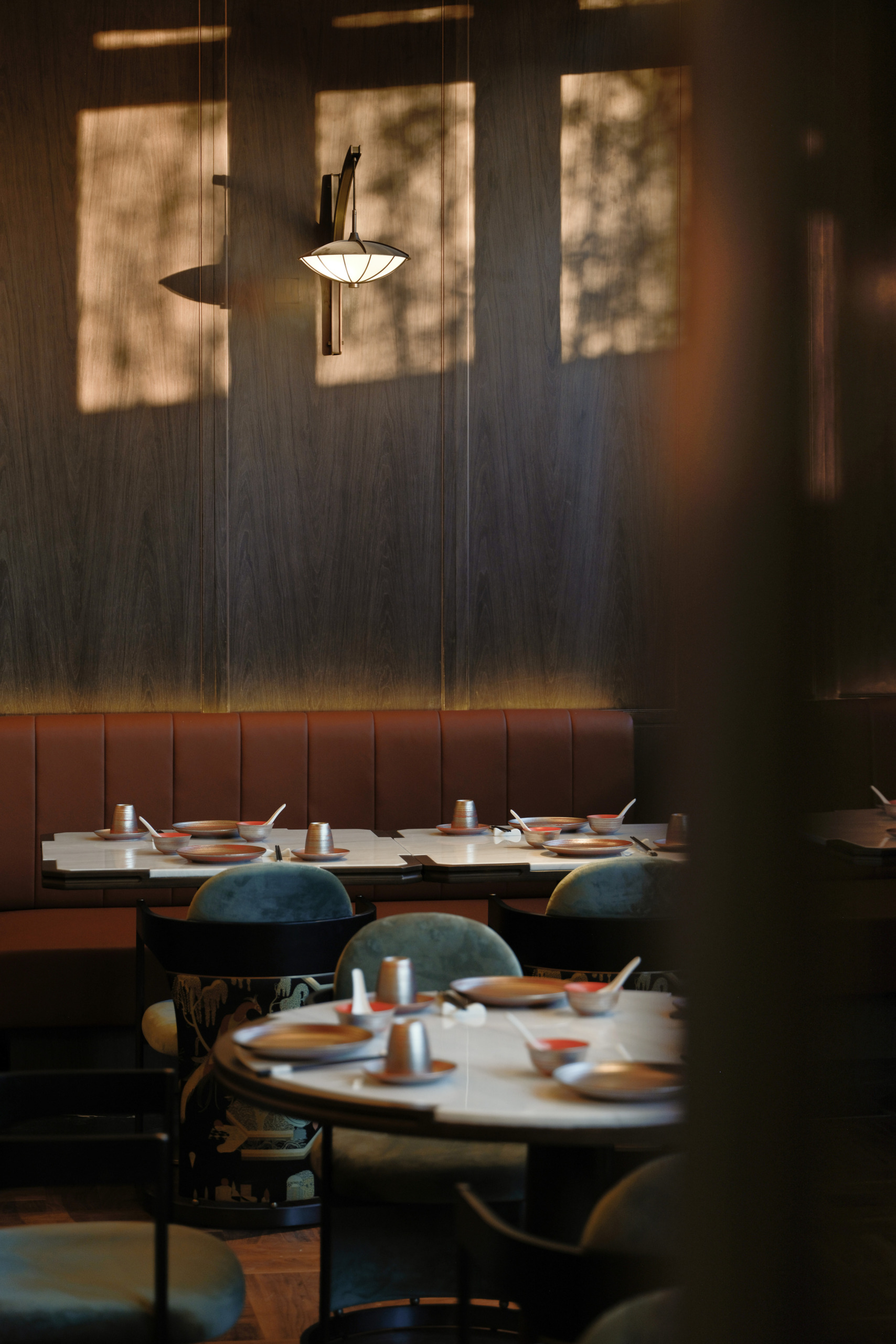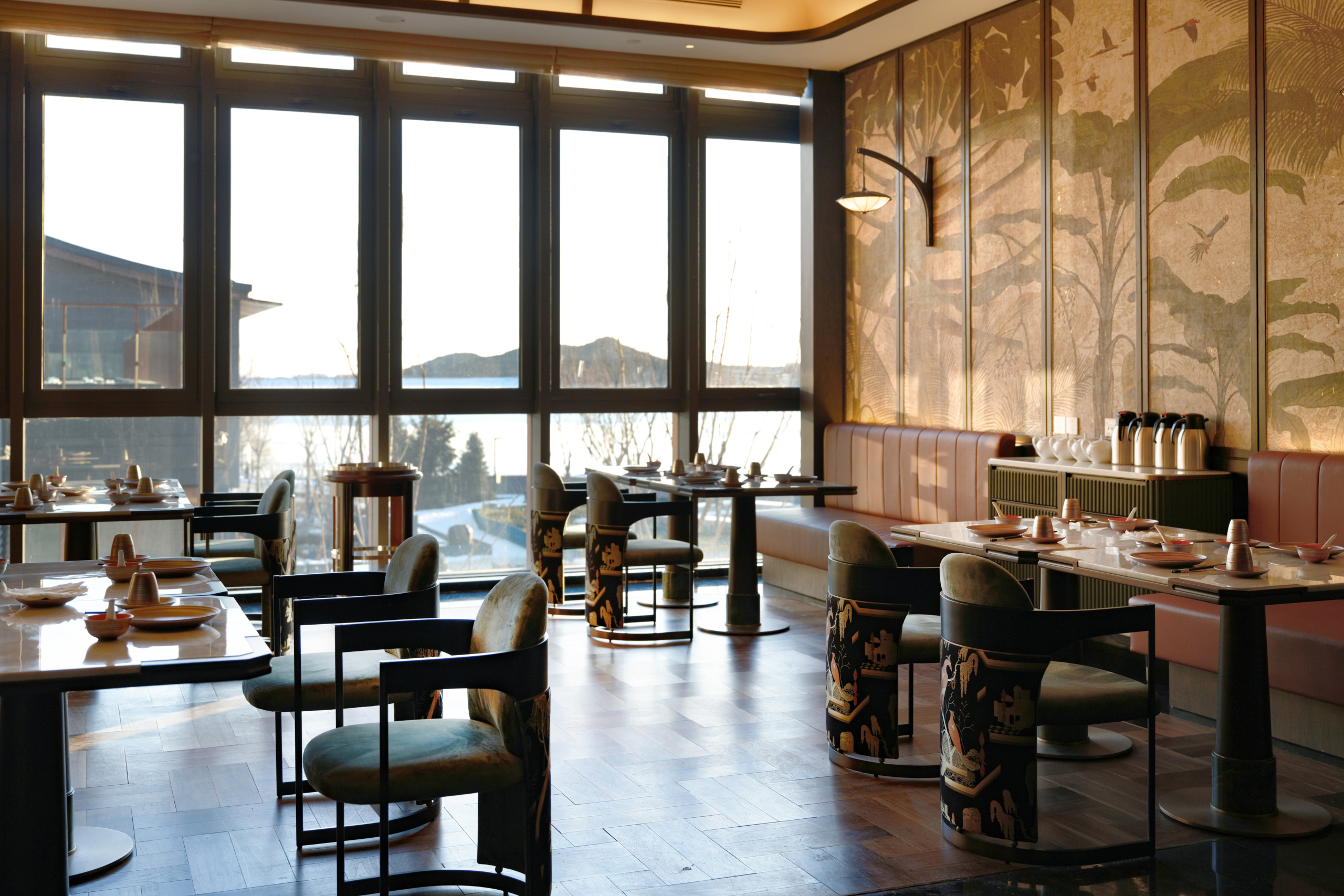 Water and Light: To echo the meditative quality of the lake, reflective finishes and lighting mimic the play of sunlight on water. Flooring and grand pendant fixtures feature patterns reminiscent of ripples, grounding the large spaces in the context of the lake.