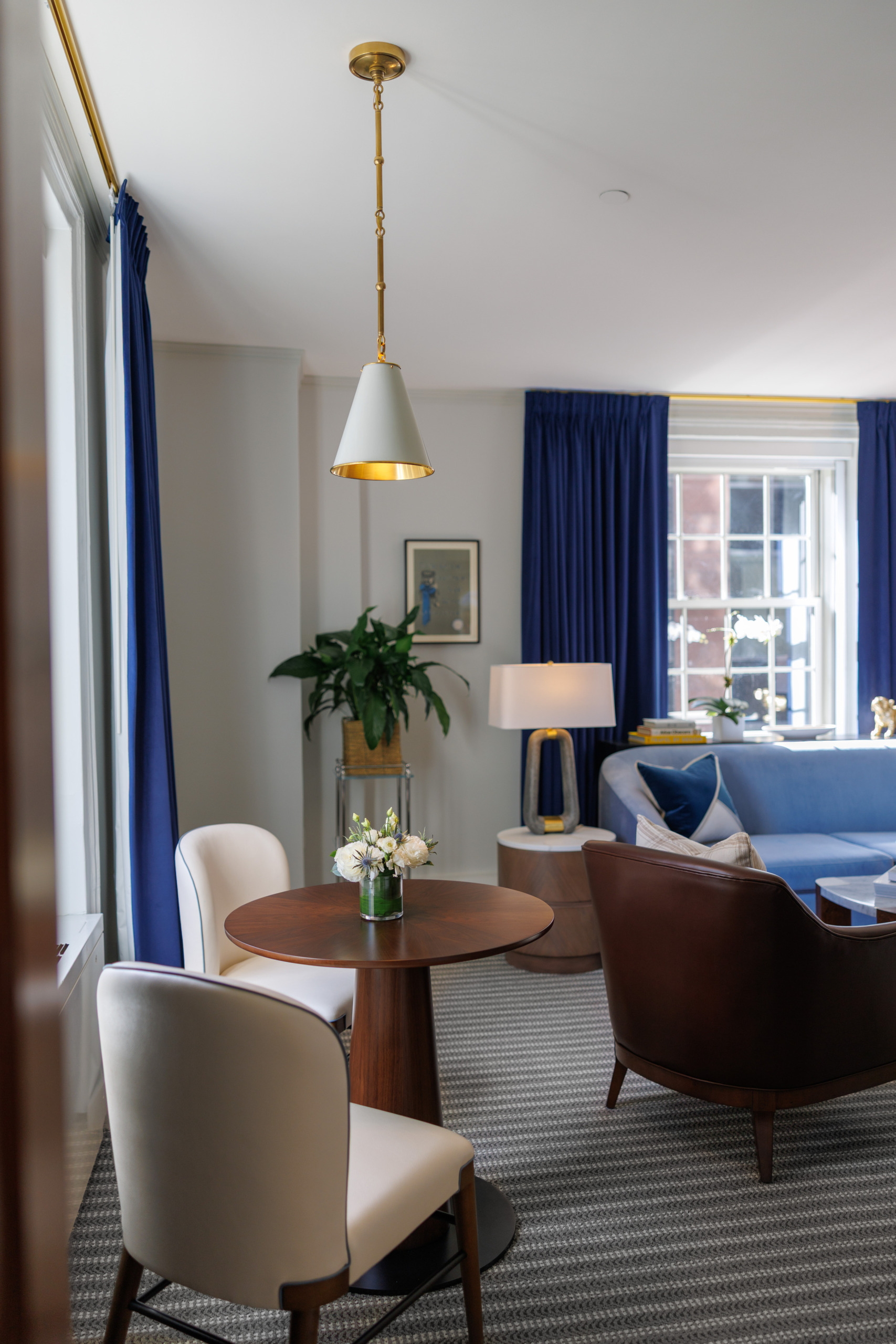 The one-bedroom suites extend this expression with darker woods, rich neutral tones, and blue-gray accents that ground the rooms in warmth and character. They are comfortable yet refined, designed for the well-traveled member who values both history and modern convenience.